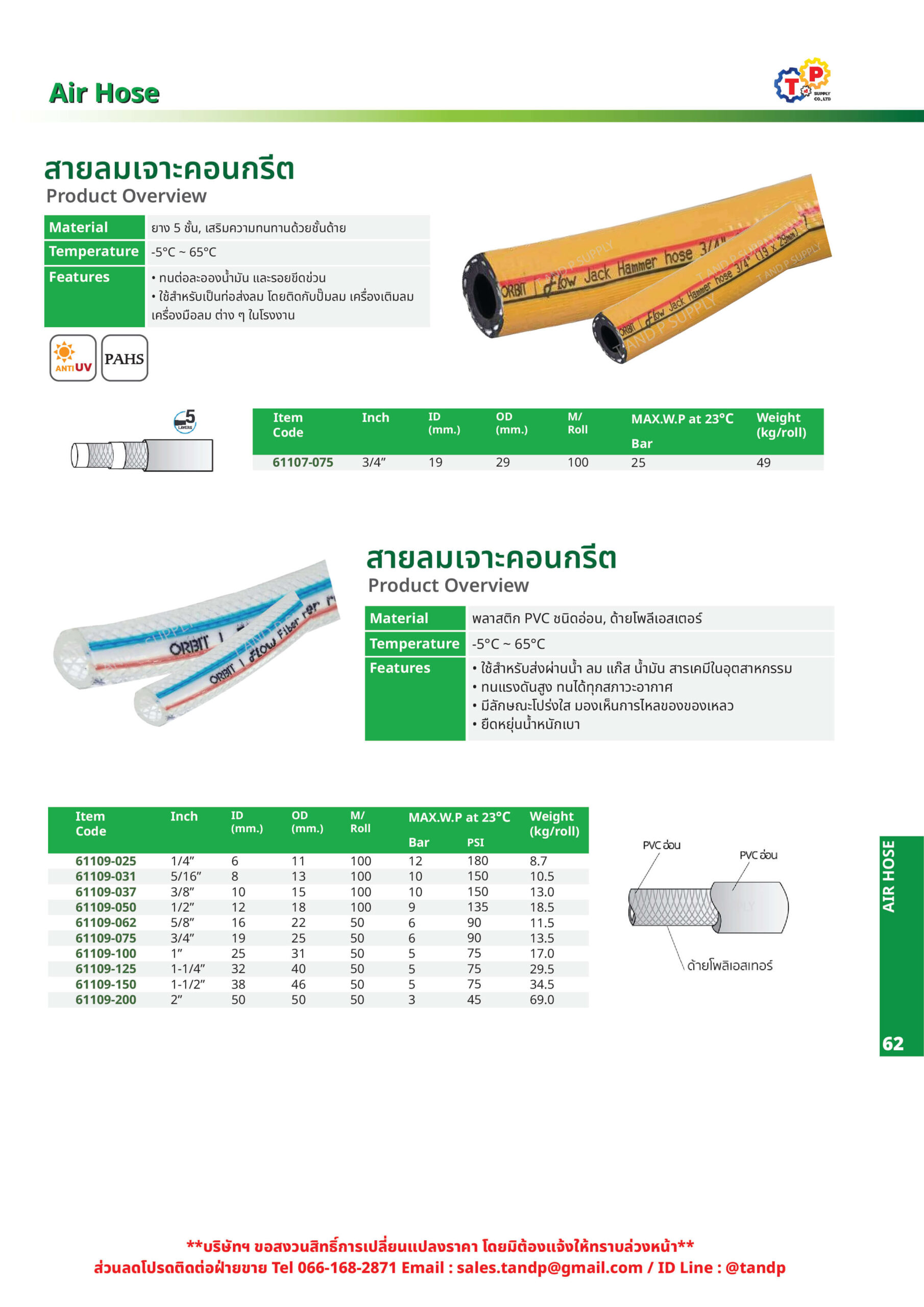 | การใช้งาน | • ทนต่อละอองน้ำมัน และรอยขีดข่วน • ใช้สำหรับเป็นท่อส่งลม โดยติดตั้งกับปั้มลม เครื่องเติมลม เครื่องมือลม ต่างๆ ในโรงงาน |