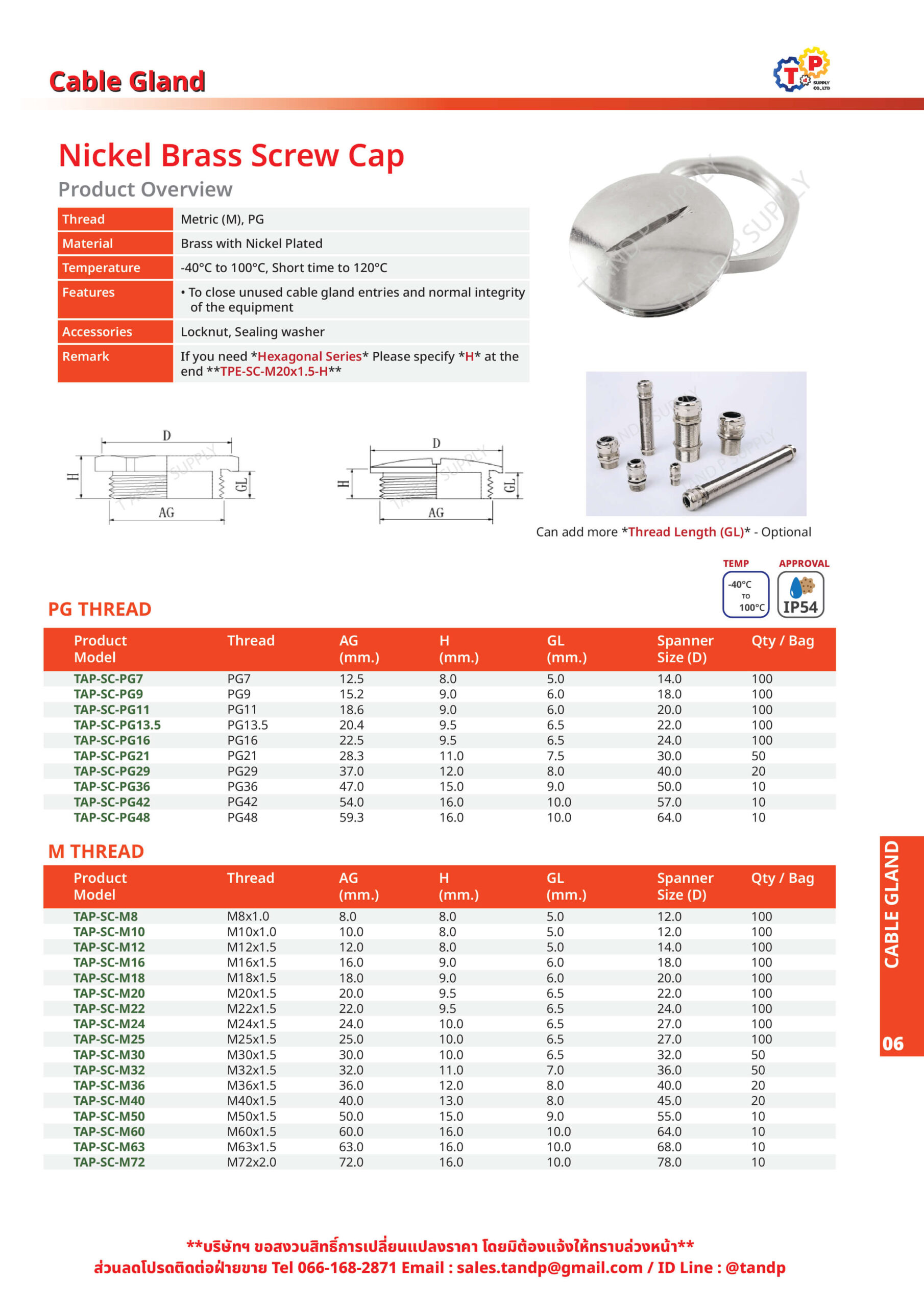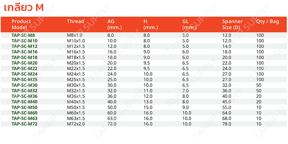 | คุณสมบัติอื่น ๆ | • ใช้ในการอุดช่องเกลียว ที่ไม่ได้ใช้งาน • ป้องกันฝุ่นและน้ำได้ดี • สามารถติดตั้งได้ง่าย |