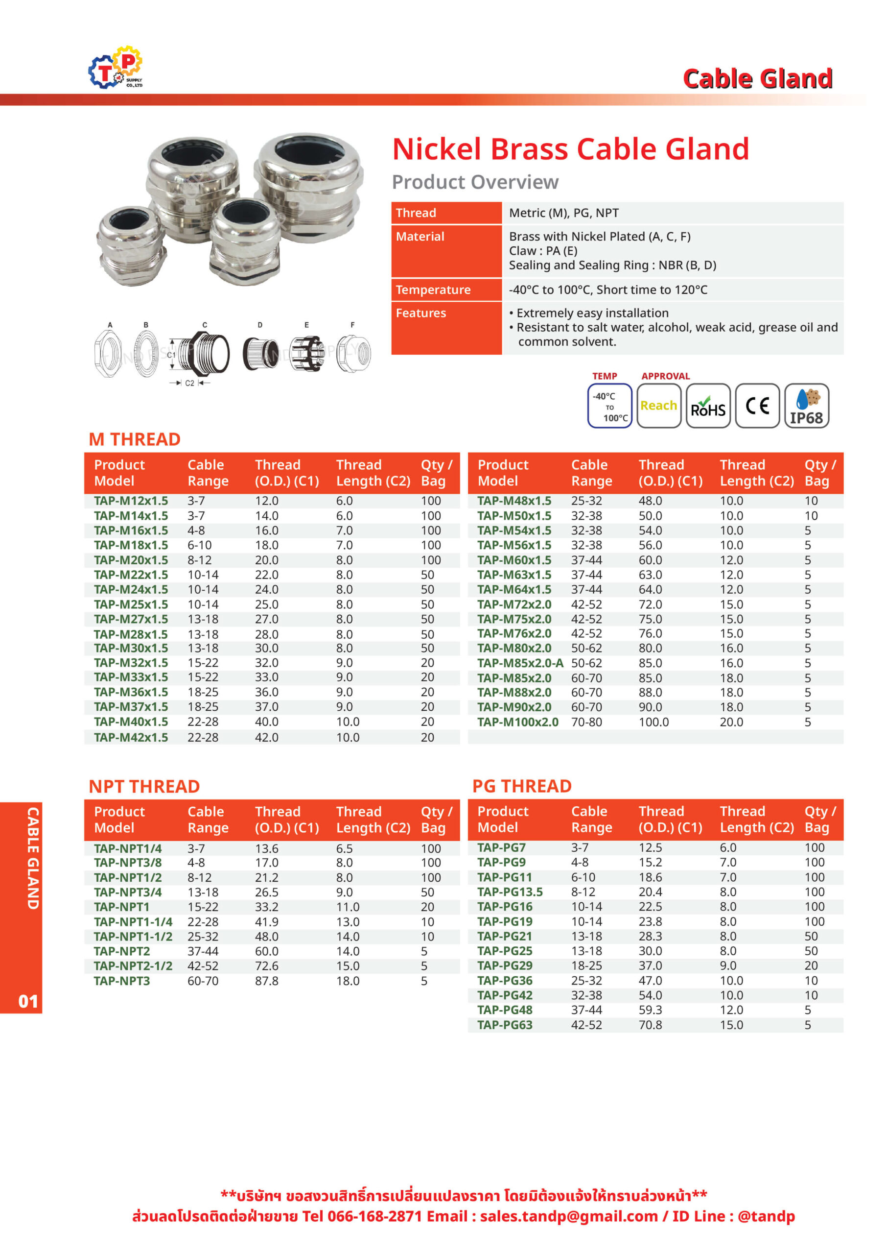 | วัสดุ | ตัวเคเบิ้ลแกลน ผลิตจากทองเหลืองชุบนิกเกิล (Nickel Brass), ซีลยางผลิตจากยาง NBR, เขี้ยวจับสายไฟผลิตจากพลาสติก PA |