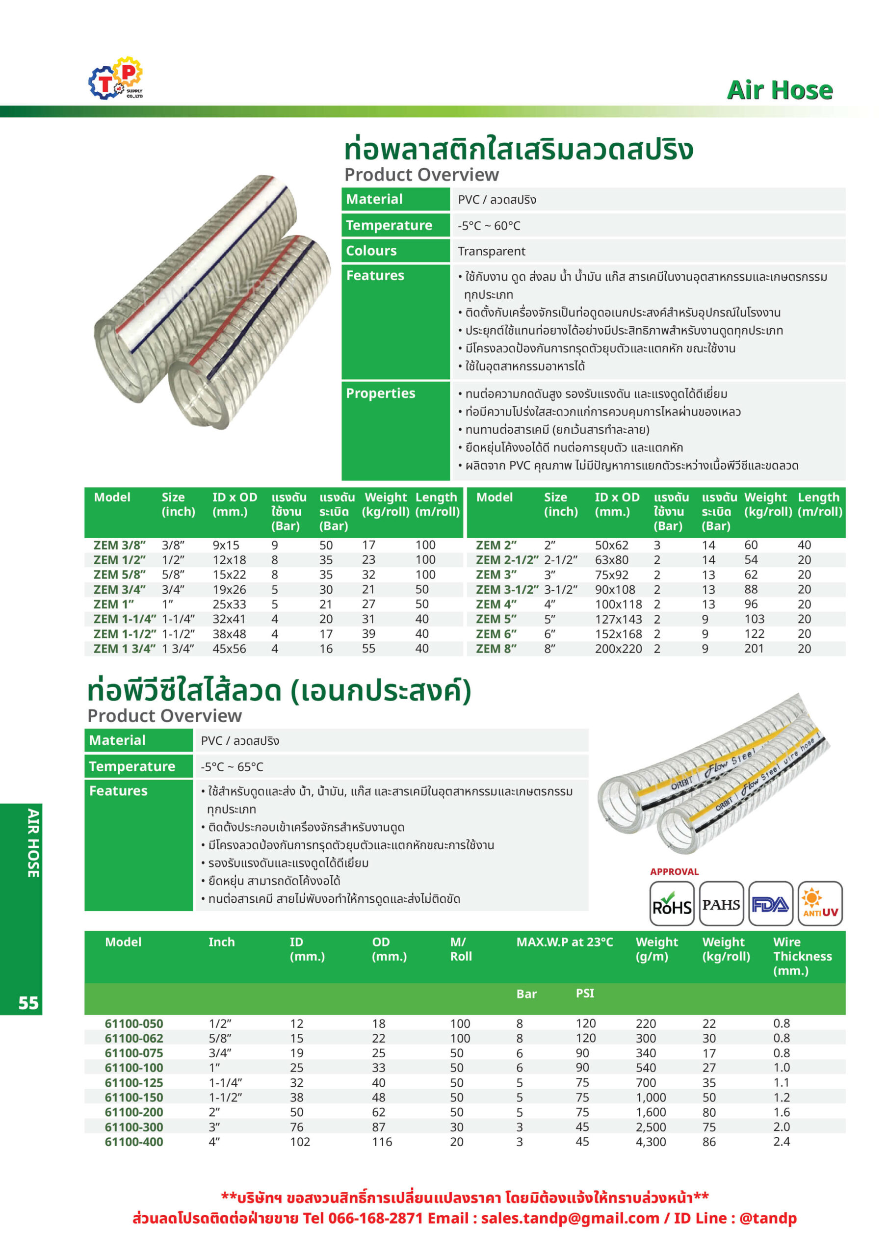 | รายละเอียด | • ใช้สำหรับดูดและส่งน้ำ, น้ำมัน, แก๊ส และสารเคมีในอุตสาหกรรม • มีโครงลวดป้องกันการทรุดตัว ยุบตัว และแตกหักขณัใช้งาน • รองรับแรงดันและแรงดูดได้ดีเยี่ยม • ทนต่อสารเคมี สายไม่พับงอทำให้การใช้งานไม่ติดขัด |